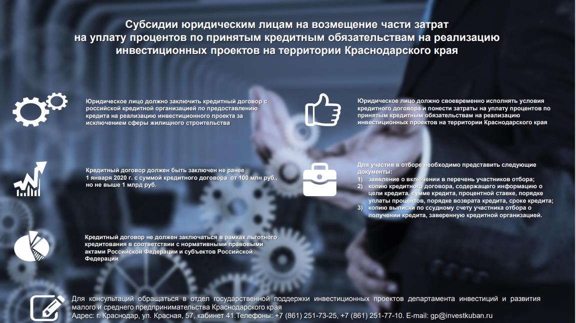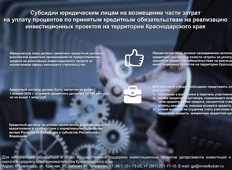 Департаментом инвестиций и развития малого и среднего предпринимательства Краснодарского края проводится отбор для предоставления субсидий юридическим лицам, являющимся инвесторами, на возмещение части затрат на оплату процентов по принятым кредитным обязательствам на реализацию инвестиционных проектов, реализуемых на территории Краснодарского края (далее - отбор). Объявление о проведении отбора размещено на сайте департамента инвестиций и развития малого и среднего предпринимательства Краснодарского края https://dirmsp.krasnodar.ru/activity/gosudarstvennaya-podderzhka-investitsionnykh-proektov/207118.